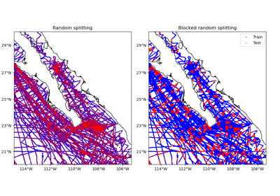 sklearn.model_selection.train_test_splitbut is tuned to work on single- or multi-component spatial data with optional weights.If arguments shape or spacing are provided, will group the data by spatial blocks before random splitting (using